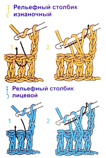 Чтобы бомбер был теплее, можно дополнительно связать к нему подкладку или пришить тканевую. Резинку на манжетах и воротнике вяжут рельефными столбиками, чередуя лицевые и изнаночные. Как вязать такие столбики видно на схеме: