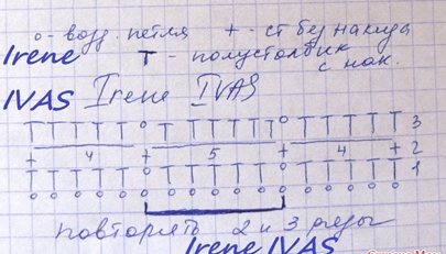 , накид, 1 лиц.) в след. петлю, 2 изн., кром. петля. 2-й ряд (изн. сторона): кром. петля, *9 лиц., 1 изн., повторять от * до посл. раппорта, закончить кромочной петлей вместо 1 изн. 3-й ряд: кром. петля, *9 изн., 1лиц., повторять от * до посл. раппорта, закончить кромочной петлей вместо 1 изн. 4-й ряд: кром. петля, *9 лиц.