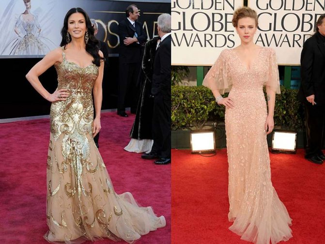 Бежевый цвет многогранен, он прекрасно подходит и для нарядов, предназначенных для самых торжественных случаев. Так, для дефиле по красной дорожке на церемонии вручения Оскара 2021 великолепное бежевое с золотом платье от Zuhair Murad выбрала Кэтрин Зета-Джонс.