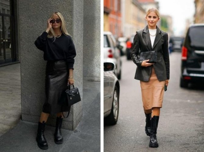 К такой обуви отлично подходят юбки всевозможных фасонов. Отличной отправной точкой для вечернего променада станет юбка длины миди и челси. Такой образ выглядит стильным и завершенным.