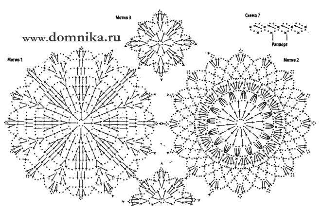 Вяжите поочередно мотивы 1 и 2. Соединяйте мотивы друг с другом в процессе вязания в местах, обозначенных на схеме, провязывая соединительные столбики.