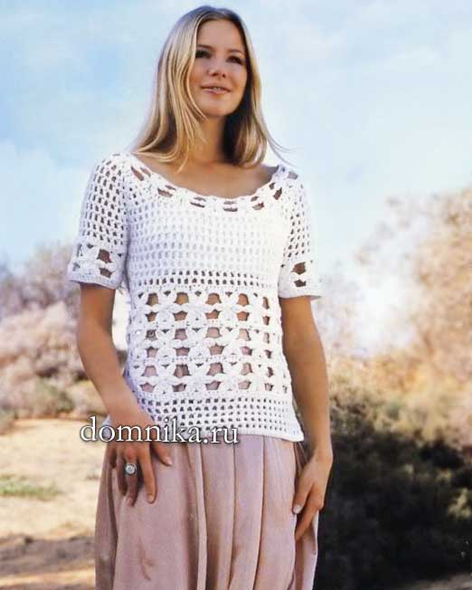 Белая летняя кофточка с короткими рукавами и шикарным вырезом горловины связана крючком из столбиков с накидом и цветочных мотивов. Сказочно красивая модель из белой хлопчатобумажной пряжи вяжется очень быстро.