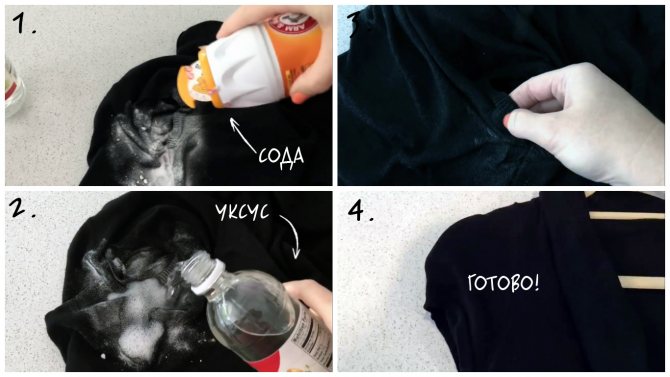 - Приготовить уксусный раствор из 1-2 ст. л. уксуса на 5 литров воды. В нем замочить вещи на полчаса. Растворить в стакане воды 4 ст. л. соды и натереть пятна получившимся раствором. Нельзя дополнительно пользоваться отбеливателем, чтобы пятна не приобрели темный цвет. Постирать как обычно.