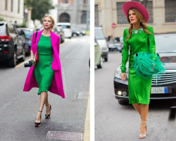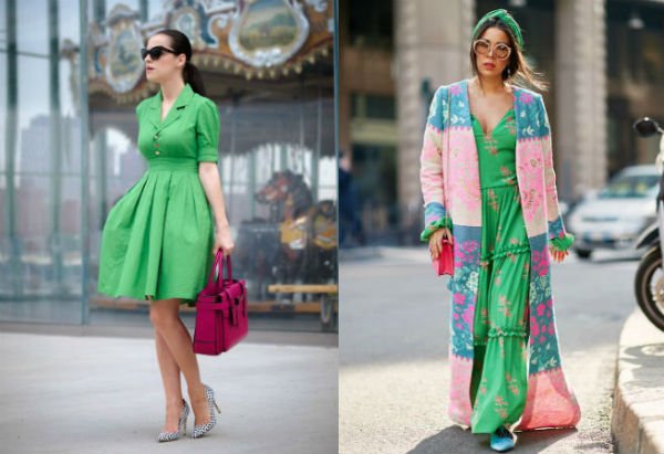 - ярко-зеленое отлично сочетается со светлыми тонами: желтым и белым. В белых босоножках под сочно-зеленое платье можно пойти куда угодно;