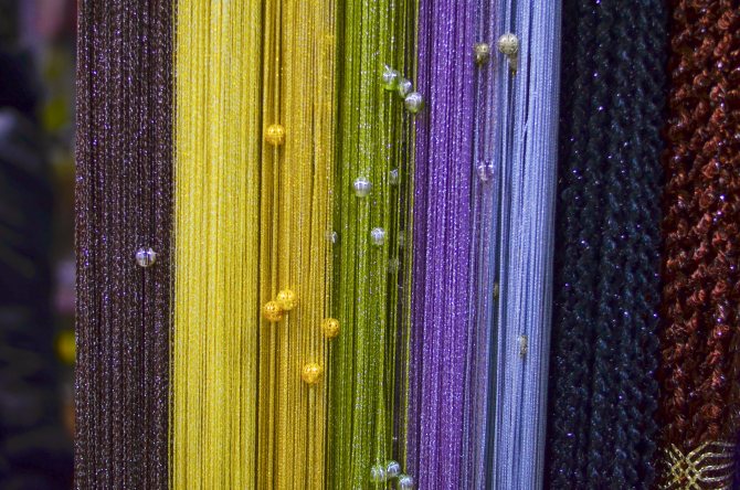 В продаже чаще всего можно встретить занавески из шелковых, хлопковых или шенилловых ниток производства Германии, Италии, Индии, Турции и Китая: шторы с висюльками и без, однотонные и цветные, выполненные из толстых или тонких нитей и самой разной фактуры. Это может быть: