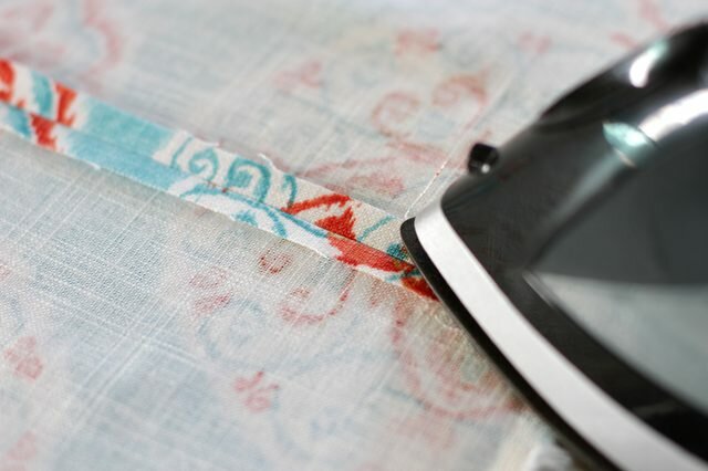 Прикалываем булавками кант по всему периметру изделия. Настрачиваем, стараясь двигаться точно по строчке. В углах ткань подрезаем.