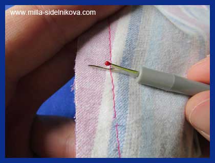 2-й, через каждые 1,5 – 2 – 2,5 см поддевая и разрезая с одной из сторон шва один стежок строчки, а затем потянув за нитку с другой стороны шва,