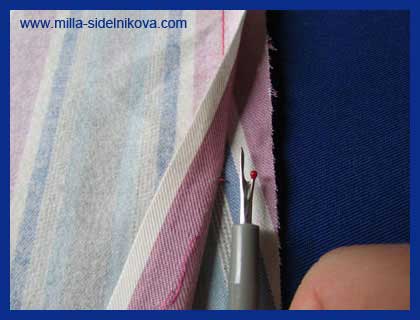Поскольку укрепительные пяти — или четырехниточные оверлочные строчки используют только для тканей средних и толстых, то дальше, вторую часть строчки — строчку через край, можно разрезать ножом – вспарывателем
