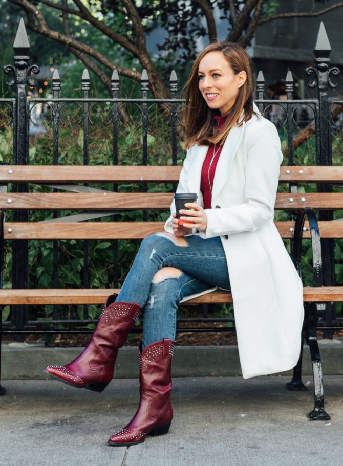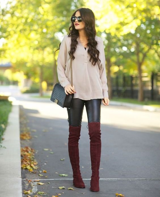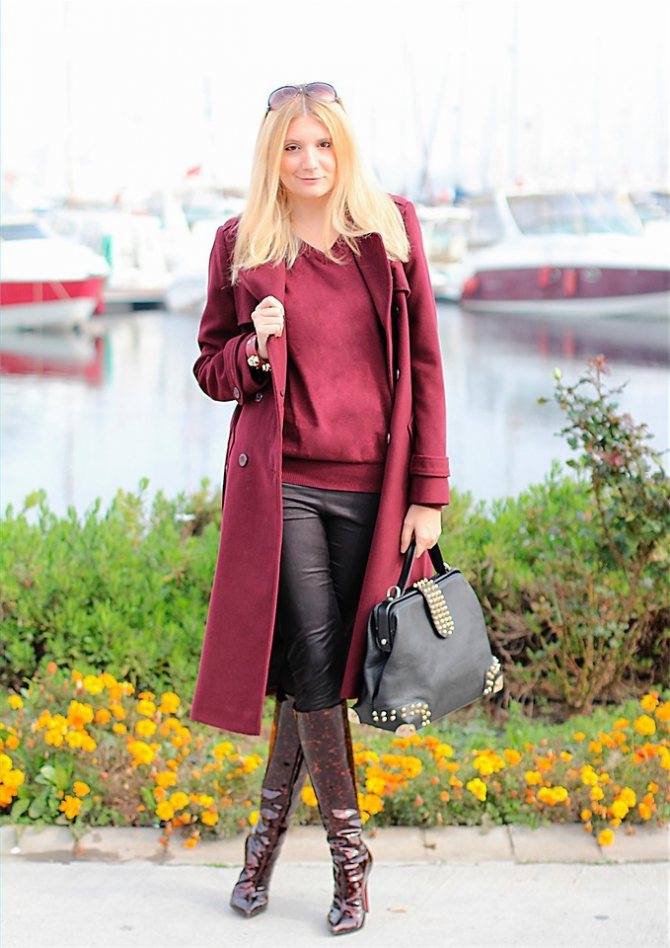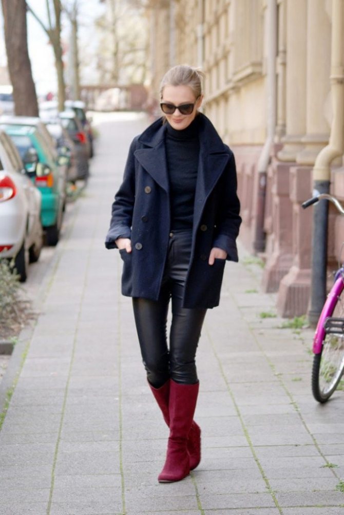 Предпочтение стоит отдавать классическим и приталенным фасонам, подчёркивающим фигуру. При грамотном подходе можно носить и оверсайз модели. Набирает популярность и коллаборация сапог с бордовой одеждой. В этом случае стоит соблюдать тенденцию перехода от светлого к тёмному. При совмещении подобных цветов облик может получиться унылым.