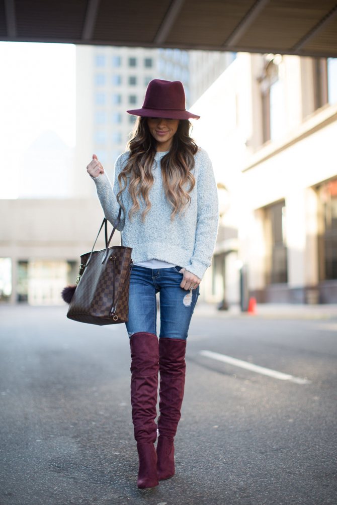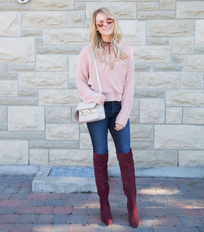 Поскольку моделей сапог создано огромное количество, комбинировать их можно с любыми предметами гардероба. При этом нет ограничений по возрасту женщины. Для того чтобы сеты, в которых присутствуют сапоги бордо, были гармоничные, нужно уметь правильно одеваться. Также необходимо со вкусом подбирать аксессуары. Тем, кто не знает, с какой одеждой носить замшевые сапоги на каблуке, очень полезны будут следующие советы: