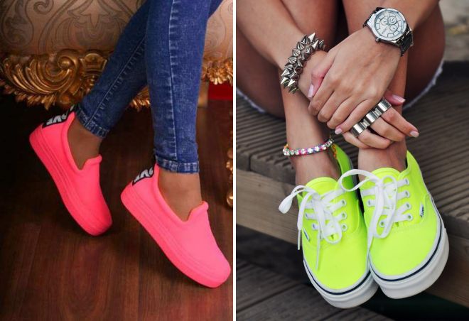 Разноцветная обувь может быть одной гаммы и контрастных цветов, на пике популярности модели с неоновой подошвой. Их комбинируют с одеждой такой же гаммы, черной или белой.