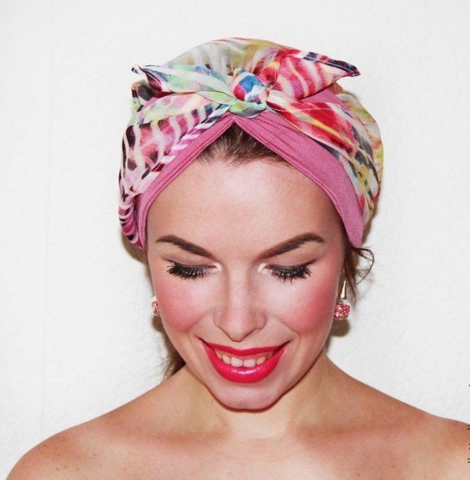 - Взять полотно яркой расцветки средней длины и пропустить через волосы, сводя концы к лобной части.