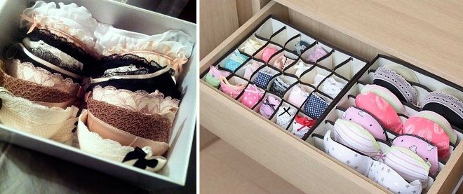 Хранение бюстгальтеров — самая большая проблема. Так как их нельзя свернуть, и они занимают много места, для них выделяется отдельный ящик, или 1 полка разделяется на 2 части.