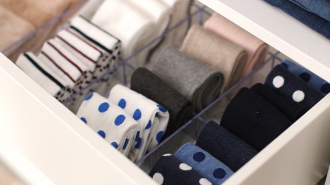 Для носков должен использоваться отдельный шкаф — они требуются каждый день чистые, поэтому должны лежать в доступном месте, чтобы не переворачивать другие вещи. Важно разложить носки по парам: один носок вкладывается в другой и прячется под резинку, образуя небольшой сверток или квадрат. Носки не должны быть вывернуты наизнанку — только лицевой стороной, где находится рисунок.