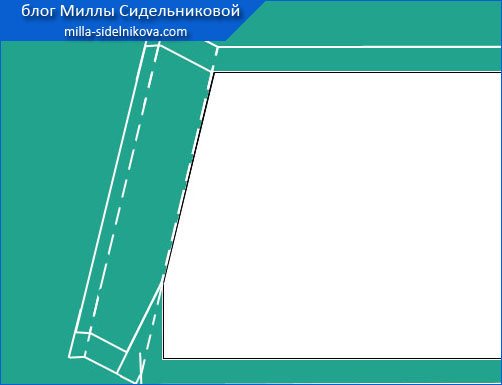 (При нанесении на ткань припусков для выполнения подгибок или цельнокроеных обтачек (вдоль входов в карман), нужно будет учитывать, что они, это зеркальное отражение некоторой части основной выкройки кармана. Это хорошо видно на картинках).