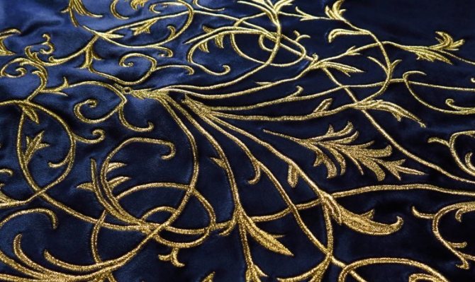 - Вышивку на полотне делают специальные автоматизированные вышивальные машины. Часто встречается бархат с вышивкой из люрексовой нити.