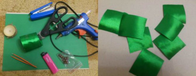 - Разрежьте фатин темно-зеленого и светло-зеленого цветов на небольшие квадраты размером 10х10 см.
