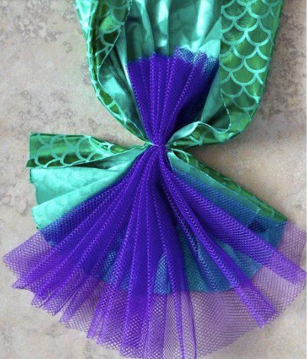 - Для начала выбирается ткань подходящего цвета и структуры. Очень эффектно смотрится хвост русалки из блестящего или ажурного материала, но можно использовать и обычный хлопок. Тем более что есть возможность в дальнейшем самостоятельно его эффектно украсить.