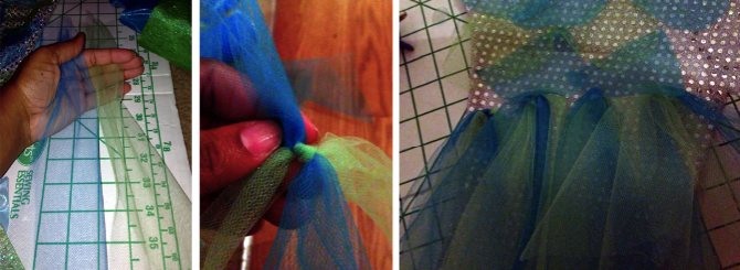 Для этого вырезаем из материала ленточки средней ширины. При выборе длины ориентируйтесь на разрезы, который выступают хвостом. Фатин должен быть одной длины с плавниками.
