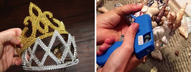 Осталось сделать тиару. Возьмите пластиковую основу-корону и наклейте сверху морские звёзды, ракушки, чтобы получилась корона морской принцессы.