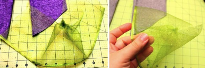 Снизу отрежьте их под углом, как на фото, отступив от края примерно 5 см. Затем вырежьте кусок органзы или фатина шириной 50 см и длиной 15 см.