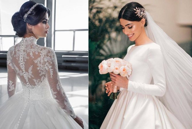 Длинный рукав может быть в виде воздушного шара, три четверти или расширенным книзу. Особый магнетизм невесте придают рукава в сочетании с маленькими элегантными перчатками. Выбор такого образа позволит девушке быть аристократкой на своей свадьбе. Очень соблазнительно смотрится спина свадебного наряда, декорированная кружевом или вышивкой. Зимние закрытые модели востребованы и у новобрачных, стремящихся подчеркнуть свой шарм и мягкую женственность.