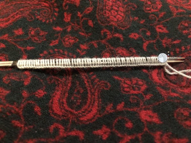 Разворачиваем вязание и вяжем лицевыми петлями 10 петель на одну спицу и 10 петель на вторую спицу.