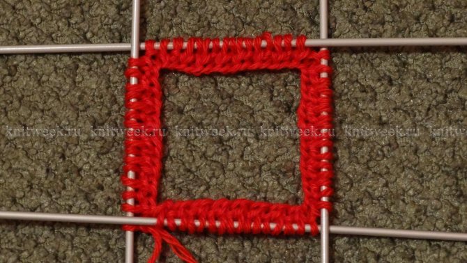 Замкните вязание в круг, при этом смотрите, чтобы петли на спицах ни в коем случае не перекрутились, и вяжите второй ряд, начав с петель на первой спице. Для маркировки начала круга отлично подойдет английская булавка или колечко, выполненное из пряжи контрастного цвета (я в этом случае пользуюсь нитью, конец которой всегда остается от наборного края, он и показывает, где петли первой и четвертой спицы соединились в круг).
