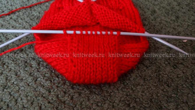 Приостановите вязание, закончив его лицевым рядом. Чтобы придать полотну форму пятки необходимо убавить петли внутри этого полотна. Для чего мысленно разделите петли на 3 части, в случае если число не делится без остатка на 3, то остаток необходимо прибавить к петлям центральной части. В моем случае получается по 9 петель по бокам и 10 петель в средней части. Начинаем убавления: