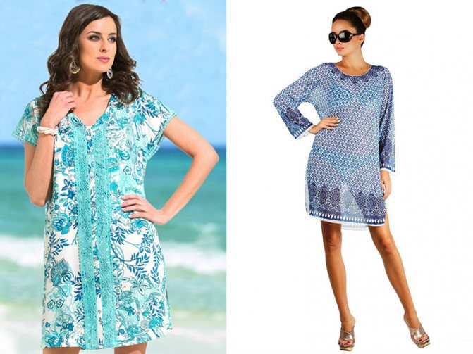 Для жаркой поры шьют легкие туники с короткими широкими рукавами или без них. Глубокий вырез горловины и пройм делает такую одежду похожей на длинные майки или платья-халаты. Летнее платье-туника чаще всего отшивается из шифона, хлопка, льна, шелка. В оформлении используют красочные принты, аппликации или оригинальные вышивки.
