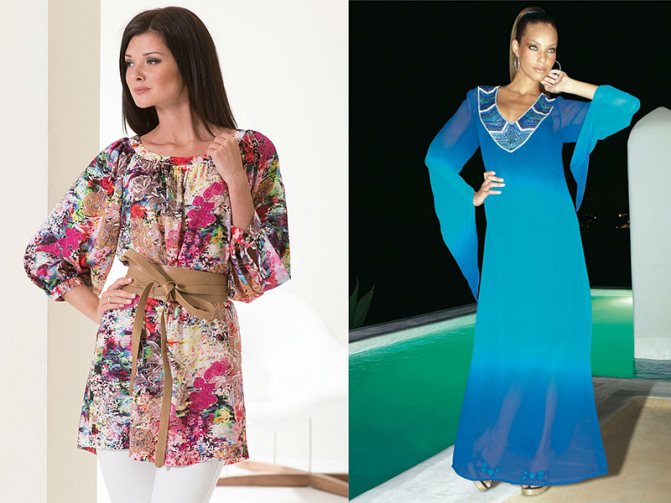 Длина рукавов доходит до запястья или на 3/4. Край бывает свободной, на манжете или собранный в резинку. Нередко попадаются модели безрукавки, больше похожие на жилеты. Платья носят свободными, на поясе или ремне. Они очень хорошо комбинируются с разными предметами одежды и дополняются аксессуарами.