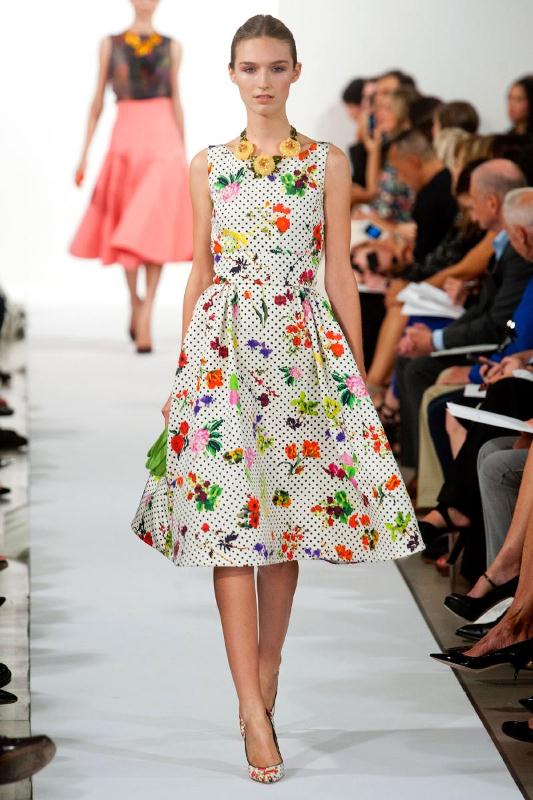 Изысканное платье в стиле 50-х с цветочным и гороховым принтом на белом фоне из коллекции модного дома Oscar de la Renta, без рукавов, длиной до колен сочетается с туфлями на высоком каблуке от Oscar de la Renta.