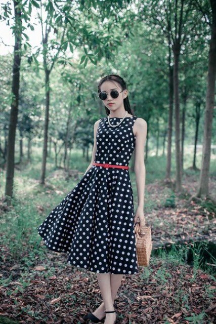 Элегантное платье в стиле 50-х черного цвета с белым гороховым принтом, без рукавов, с облегающим верхом и расклешенной юбкой, длиной ниже колен составит гармоничный ансамбль с тонким ремнем красного оттенка, небольшой сумкой и туфлями черной расцветки на среднем каблуке.