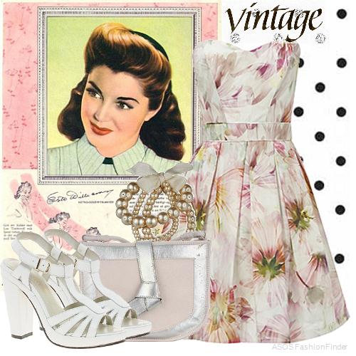 Нежное платье в стиле 50-х с растительным узором на белом фоне, с корсетным верхом, длиной до колен великолепно гармонирует с небольшой сумкой и босоножками белой расцветки на высоком толстом каблуке.