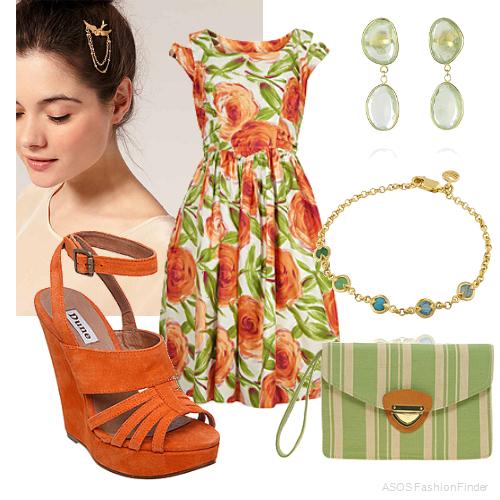 Великолепное платье в стиле 50-х с цветочным принтом, с короткими рукавами, приталенного покроя и юбкой в складку длиной до колен составит отличный образ с модным клатчем и босоножками оранжевой расцветки на высокой танкетке.