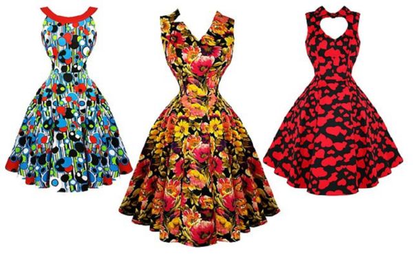 Расцветки ретро-платьев представлены невероятной широкой цветовой палитрой. Наибольшей популярностью пользуются принты с использованием геометрических форм – горох, клетка, полоска, а также яркие цветочные мотивы. Однако однотонные наряды темных оттенков с контрастной отделкой на топе, подоле юбки и поясе тоже выглядят очень элегантно и эффектно.