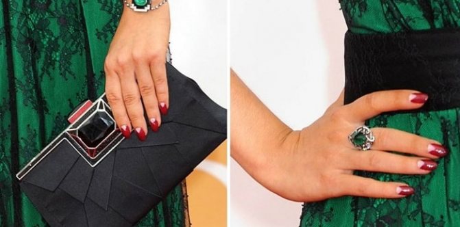 С роскошным вечерним платьем насыщенного изумрудного цвета стоит сделать лаконичный французский маникюр, которые будет сочетать классические цвета (красный, черный, белый) или глубокие оттенки других (синий, бордо, коричневый). Эксперименты с цветом в таком случае будут неуместны.