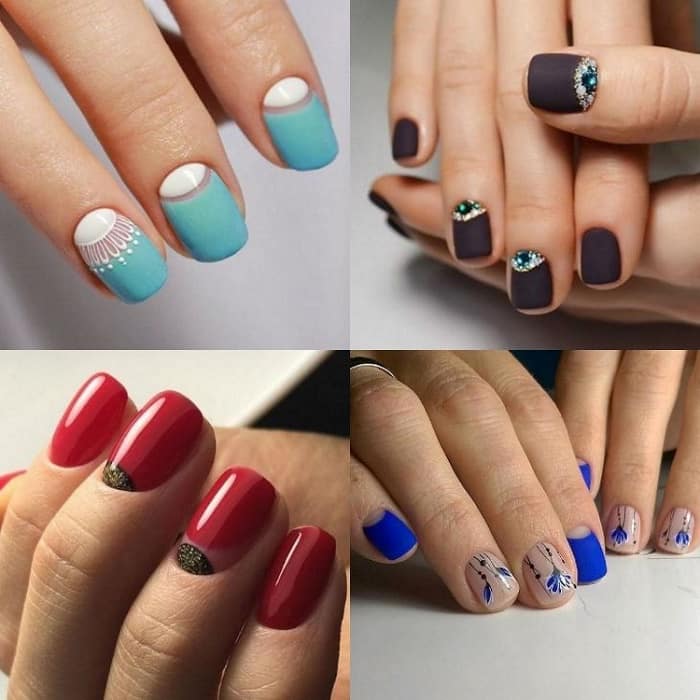Такое трендовое решение хоть и не новость, но на него стоит обратить внимание при выборе стиля оформления ноготков. Тенденции подобного маникюра – сочетать контрастные оттенки (красный и белый, синий и черный и т.д.). Но возможны варианты совместимости цветов, близкими друг к другу (к примеру, насыщенный травяной и светлый оттенок мятного).