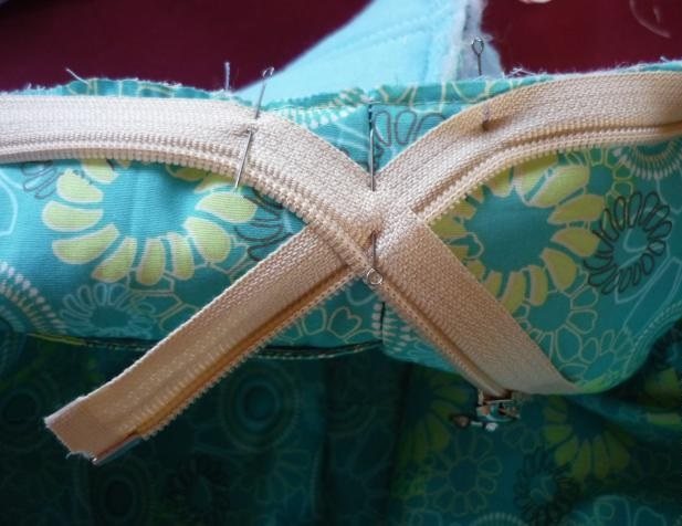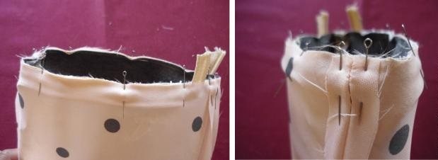 - Обрабатывается верх изделия путем прикладывания полочек недалеко от зубцов молнии и фиксации булавками;