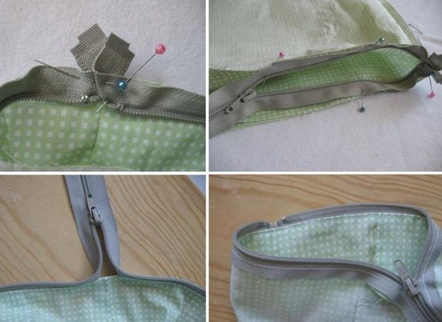 Важно! Пришивать ткань в первом способе нужно при закрытой застежке. Для второго варианта подойдет декоративная молния, так как при большей длине она может торчать из сумки.