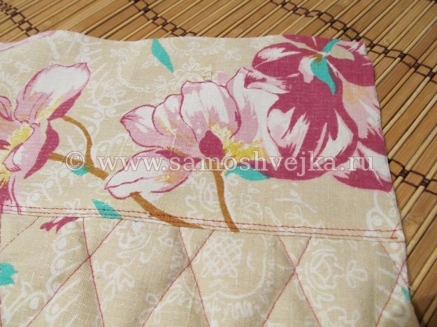 Каждый простёганный прямоугольник выравниваем. Размеры стали 47 х 23 см. Затем выкраиваем две детали из основной ткани размером 47 х 16 см и сшиваем каждый из них с простёганой частью.