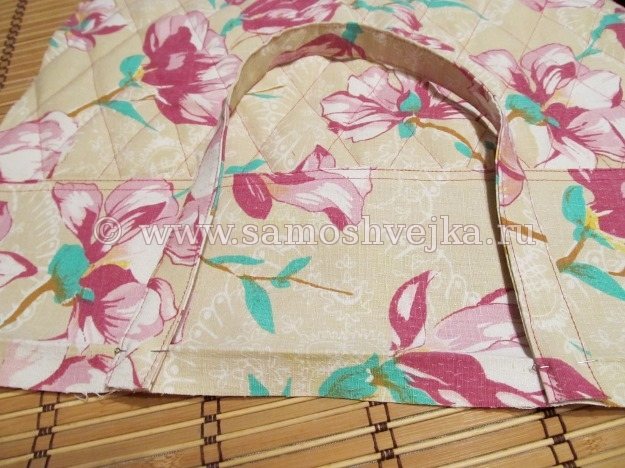 Перед тем как пришивать ручки отложите на лицевом полотне с каждой стороны по 13 см, приложите ручку к верхнему срезу основной детали, прикрепите булавкой и прострочите по краю.