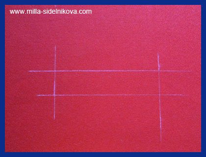 Дальше. Теперь по линии входа в карман нужно выполнить разрезание полочки. Чтобы эту «процедуру» было удобнее выполнять, с изнаночной стороны изделия чертим рамку, соединив концы выполненных строчек линиями. По середине рамки проводим ещё одну линию. Из точек на этой линии, на расстоянии 1,3 – 2 см (по модели) от коротких поперечных сторон рамки, ко всем четырем углам рисуем ещё четыре линии.