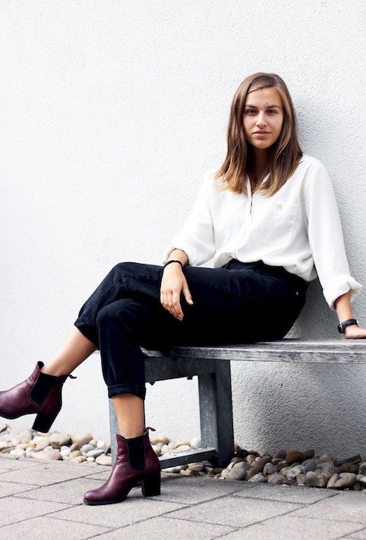 - Брюки, «челси» и водолазка. Такой комплект подойдёт как для повседневной носки, так и для работы в офисе.