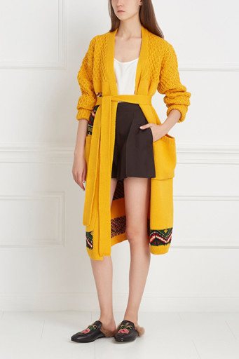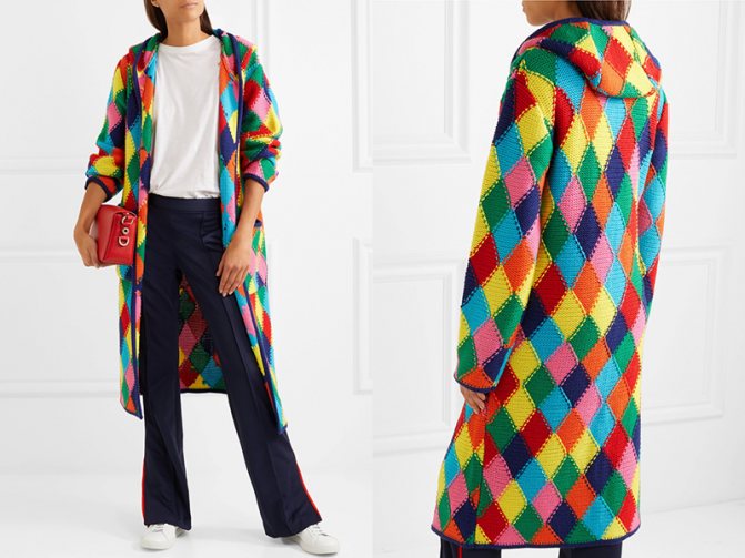 Кардиган в виде пальто с необычными пуговицами и пушниной на воротнике в этом сезоне предлагаются с этническими узорами и полосками. Изделия пастельной палитры дополняют яркими аксессуарами, яркие модели – спокойными.