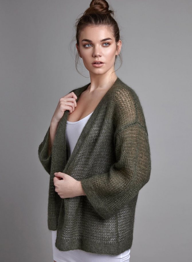 Мохер – позволяет создать объемное изделие, которое сочетается с облегающим низом – легинсами, скини, чиносами. Если вязка тонкая, то такой кардиган носят с бойфрендами и джинсами прямого покроя. Изделие получается очень тонким, практически невесомым, но теплым, не стесняет движения.