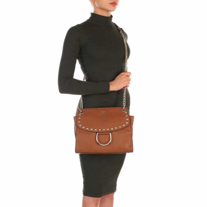 - Если данная сумка контрастирует со всем остальным луком, будет неплохо поддержать ее дополнительным аксессуаром в такой же палитре. Например, это может быть ремень или шелковый платок в благородном шоколадном оттенке.