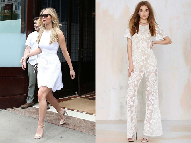 Модели укороченного формата хорошо смотрятся на обладательницах стройных ног. Если женщина опасается полностью белого наряда, она сможет подобрать монохромный вариант или белое платье с отделкой. Дизайн изделия определяется его назначением.