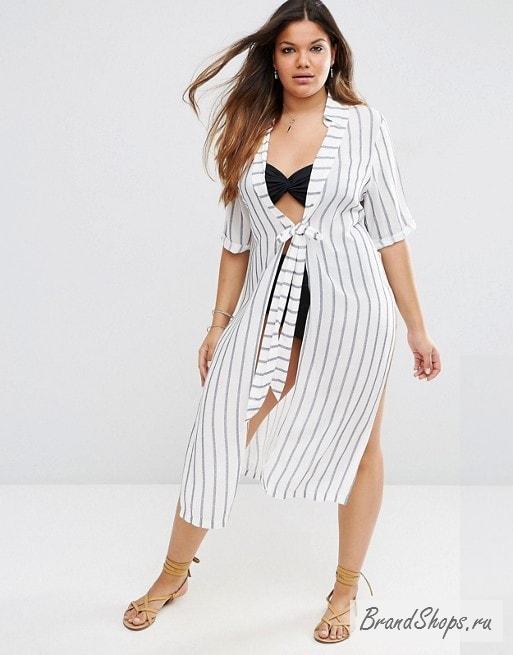 - Летящее и очень свободное платье-рубашка с использованием тканей с вертикально расположенной полоской, с длиной до колена или мини. Такая модель позволит визуально сделать фигуру стройнее.