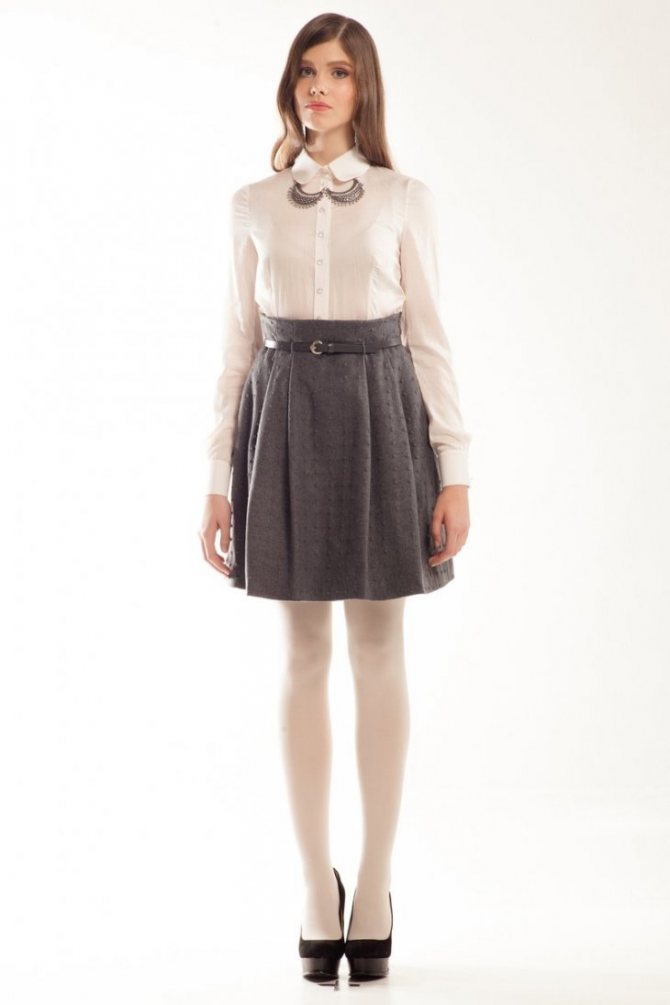 Итак, у нас есть серая строгая юбка с завышенной талией. Белая блуза с маленьким строгим воротничком здесь будет как нельзя кстати. Черные туфельки на каблуке, высокие сапоги, темно-серые, либо черные колготки. Подчеркнуть тонкую талию поможет широкий черный пояс или ремень.